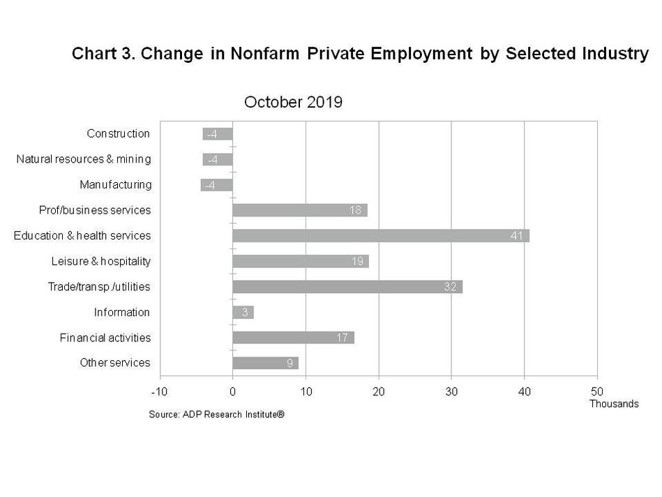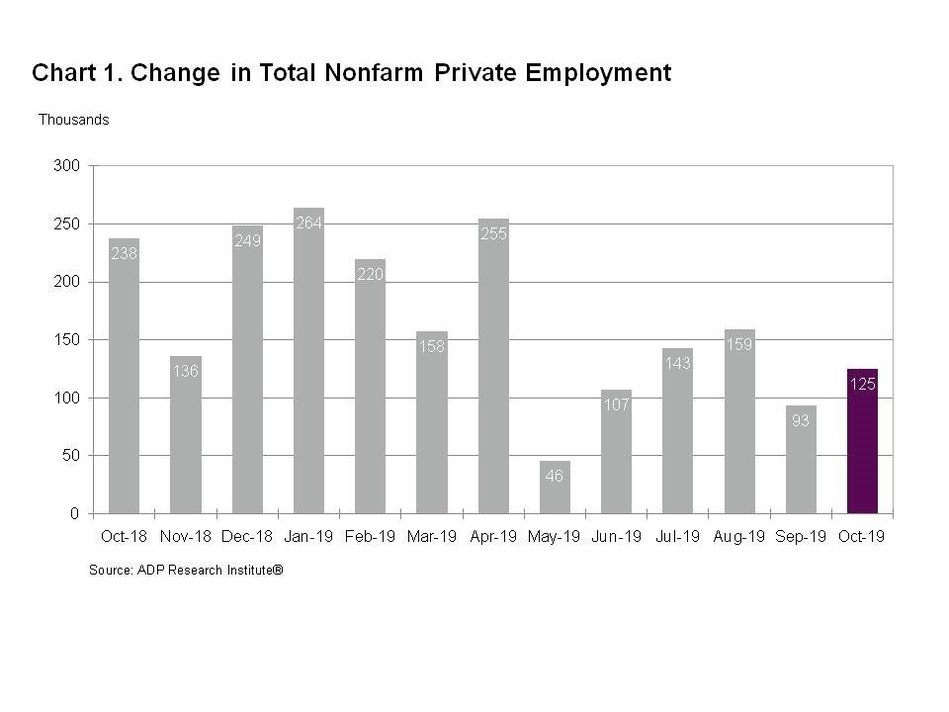 Private sector employment increased by 125,000 jobs from September to October according to the October ADP National Employment Report. Broadly distributed to the public each month, free of charge, the ADP National Employment Report is produced by the ADP Research Institute in collaboration with Moody’s Analytics. The report, which is derived from ADP’s actual payroll data, measures the change in total nonfarm private employment each month on a seasonally-adjusted basis.
